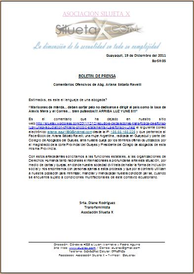 Es el comentario que ha dejado en nuestro sitio web:http://siluetax.wordpress.com/2011/12/12/repudio-a-declaraciones-trans-fobica-de-alfonso-luz-yunez-repudiation-of-trans-phobic-statements-luz-alfonso-yunez/ el siguiente correo electrónico: ariana_azul1990@hotmail.com desde la IP: 186.68.168.225 y que pertenece al Face-Book de: Ariana Sábato Ravelli, una mujer Argentina , radicada en Guayaquil y parte del Colegio de Abogados del Guayas, ante nuestra queja por los términos ofensivos utilizados por el magistrado de la corte Provincial del Guayas y Presidente del Colegio de abogados de esta misma Provincia.