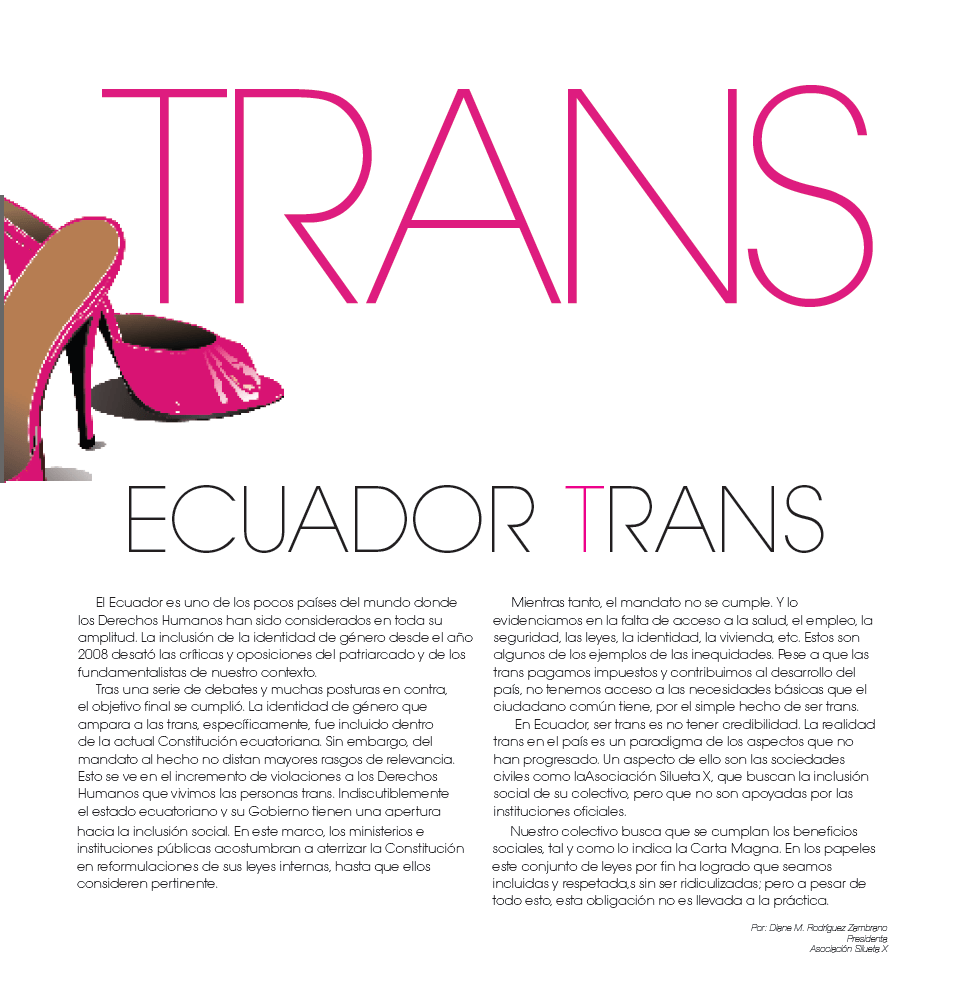 En Ecuador, ser trans es no tener credibilidad. La realidad trans en el país es un paradigma de los aspectos que no han progresado. Un aspecto de ello son las sociedades civiles como la Asociación Silueta X, que buscan la inclusión