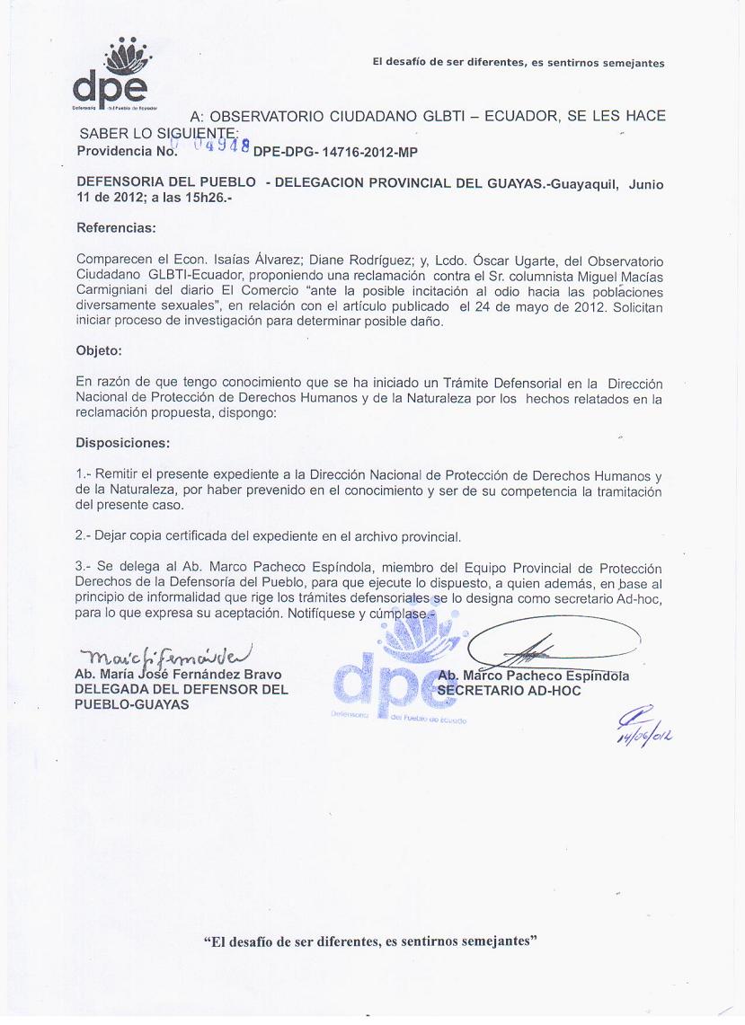 El Observatorio GLBTI del Ecuador informa que la Defensoría del Pueblo de Guayaquil Traslada las quejas legales en contra del Padre Paulino Toral y Columnista Miguel Macías a la “Dirección Nacional de Protección de Derechos Humanos” de Quito, por asegurar la competencia a este departamento, según comunicado emitido por la misma institución y firmada porla Abg. María José Fernández (Delegada del Defensor del Pueblo en Guayaquil) y el Abg. Marco Pacheco.