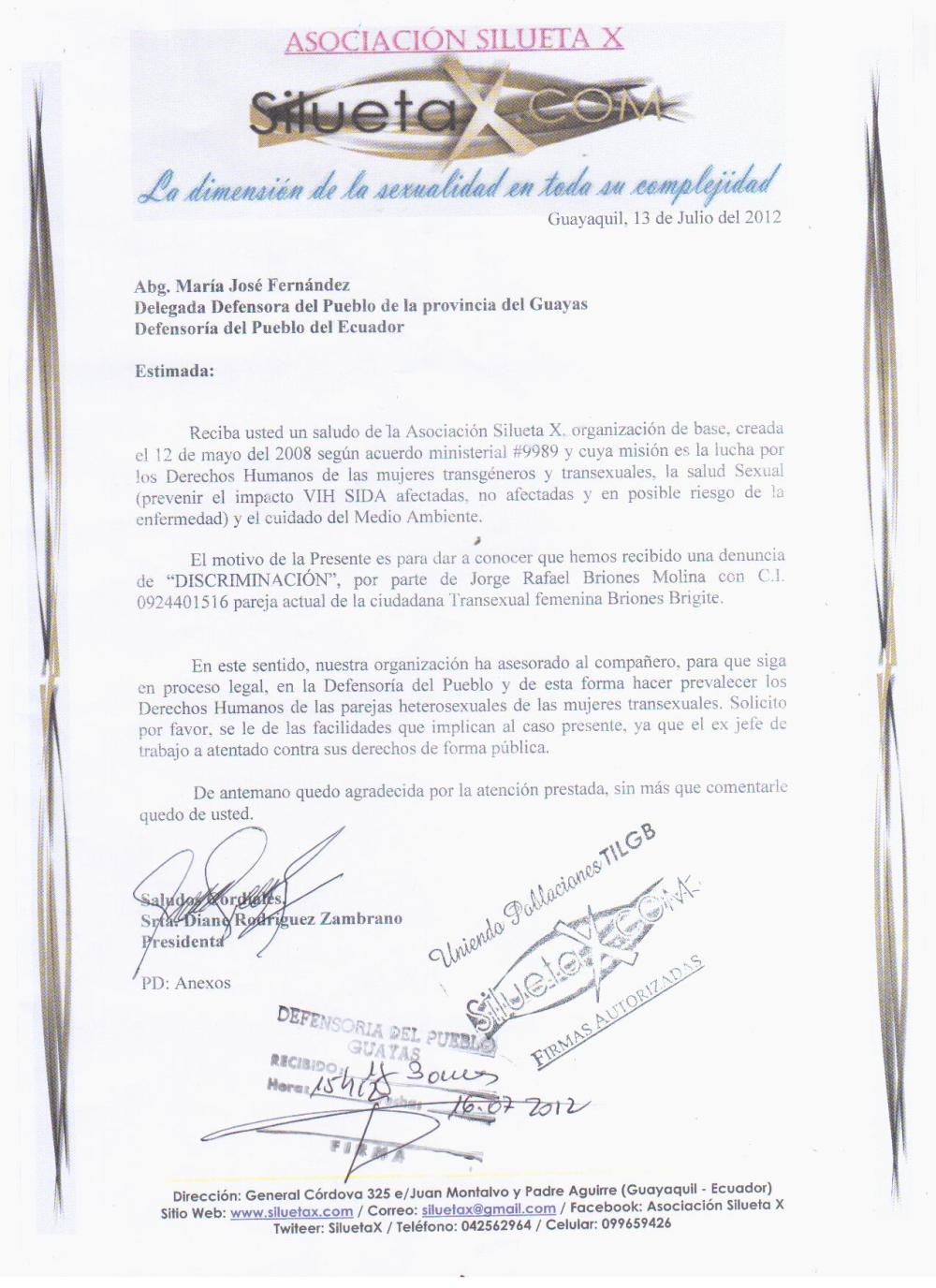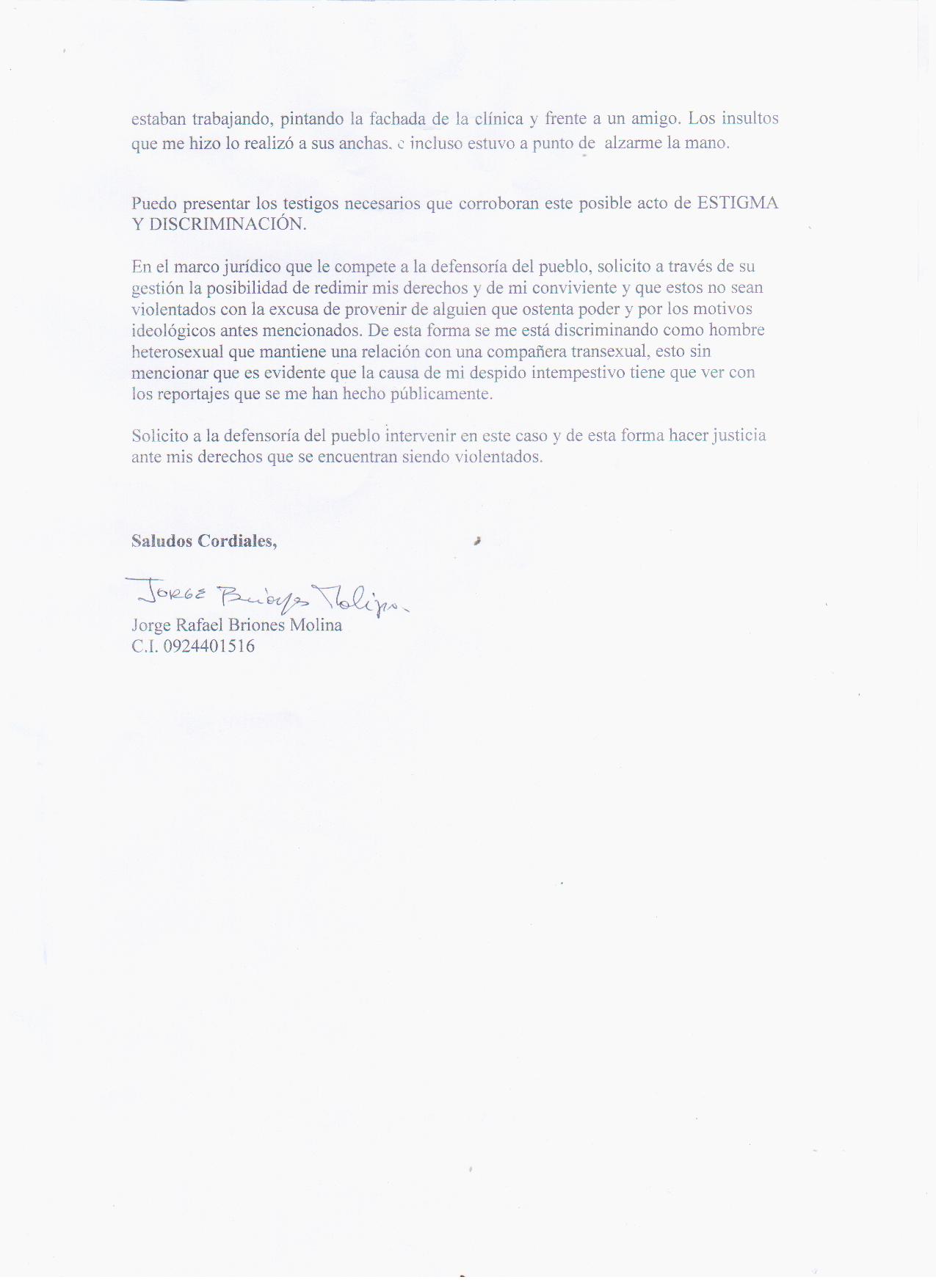 El motivo de la Presente es para dar a conocer que hemos recibido una denuncia de “DISCRIMINACIÓN”, por parte de Jorge Rafael Briones Molina con C.I. 0924401516 pareja actual de la ciudadana Transexual femenina Briones Brigite.