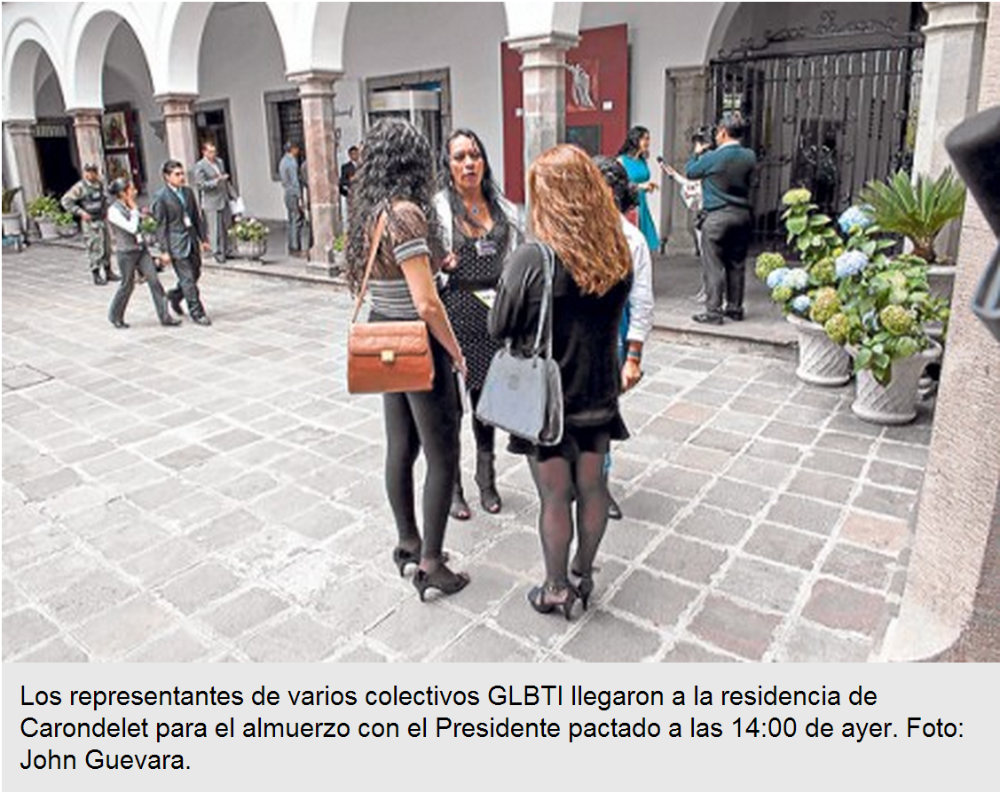 En diciembre de 2013 un presidente ecuatoriano se reunió por primera vez con representantes del colectivo GLBTI en el país. La cita fue calificada por un sector de la comunidad gay como ‘histórica’. Luego del diálogo vinieron las declaraciones y los compromisos acordados. Uno de estos era investigar las 20 muertes de personas GLBTI (15 eran transexuales) en el país, además de facilitar la inscripción de las uniones de hecho entre parejas del mismo sexo.