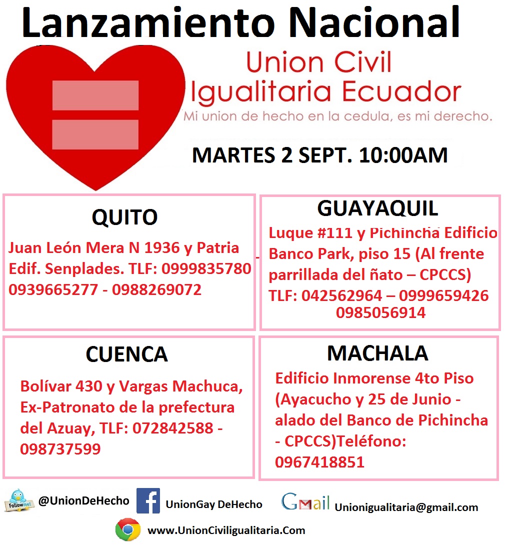 Lugar: Juan León Mera N 1936 y Patria Edif. Senplades , a las 10:00 am del Martes 2 de Septiembre del 2014, Teléfono: 0999835780 – 0939665277 – 0988269072 – Unionigualitaria@gmail.com