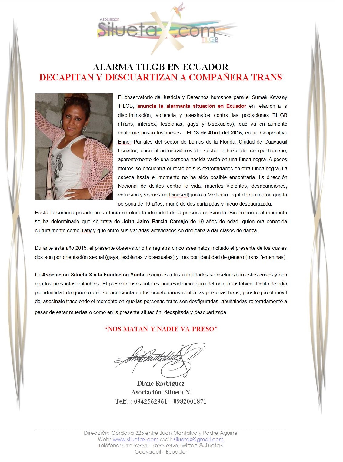 La Asociación Silueta X y la Fundación Yunta, exigimos a las autoridades se esclarezcan estos casos y den con los presuntos culpables. El presente asesinato es una evidencia clara del odio transfóbico (Delito de odio por identidad de género) que se acrecienta en los ecuatorianos contra las personas trans, puesto que el móvil del asesinato trasciende el momento en que las personas trans son desfiguradas, apuñaladas reiteradamente a pesar de estar muertas o como en la presente situación, decapitada y descuartizada.