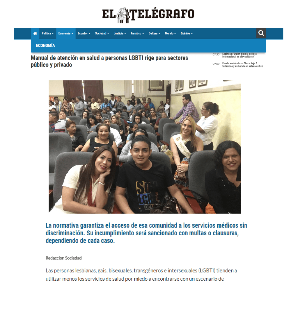 Esta noticia ha sido publicada originalmente por Diario EL TELÉGRAFO bajo la siguiente dirección: http://www.eltelegrafo.com.ec/noticias/sociedad/4/manual-de-atencion-en-salud-a-personas-lgbti-rige-para-sectores-publico-y-privado