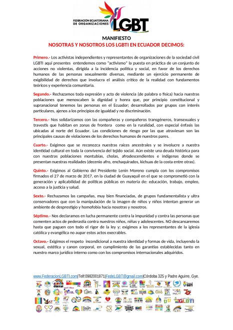 Dado en el cantón Pedro Carbo, por la Asamblea General de la Federación Ecuatoriana de Organizaciones LGBTI, el 05 de mayo de 2018.