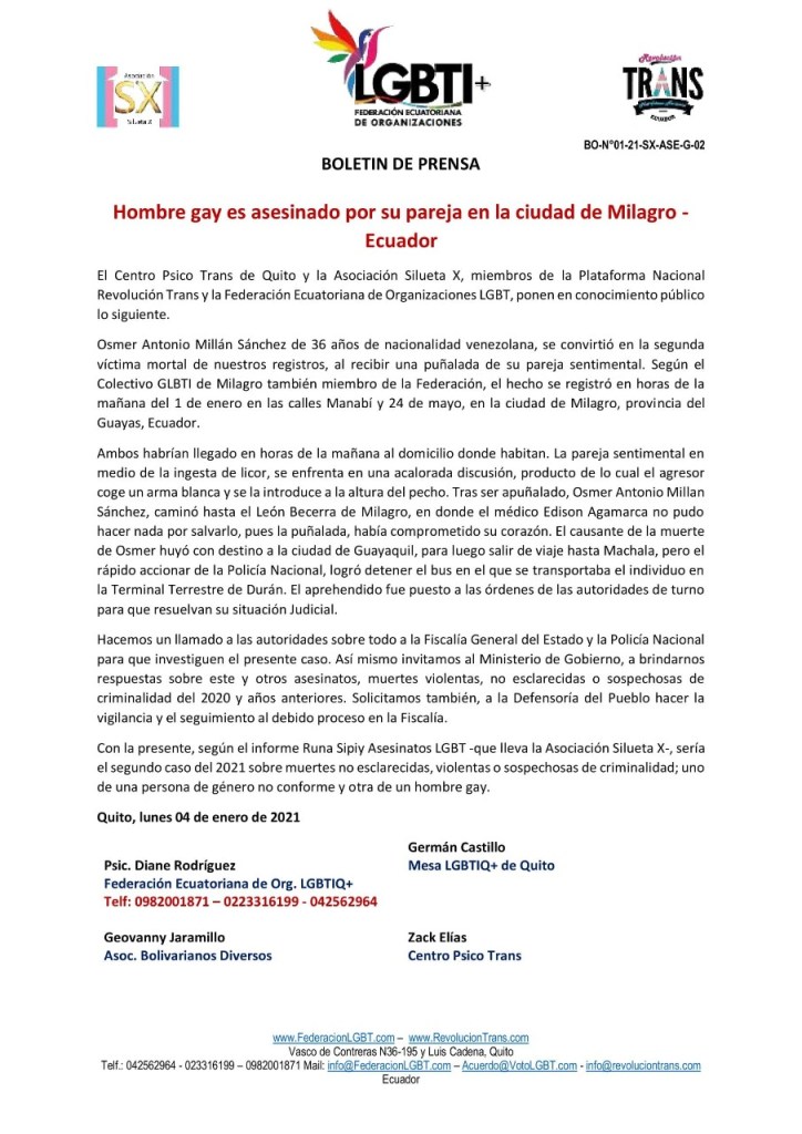 BOLETIN DE PRENSA Hombre gay es asesinado por su pareja en la ciudad de Milagro – Ecuador