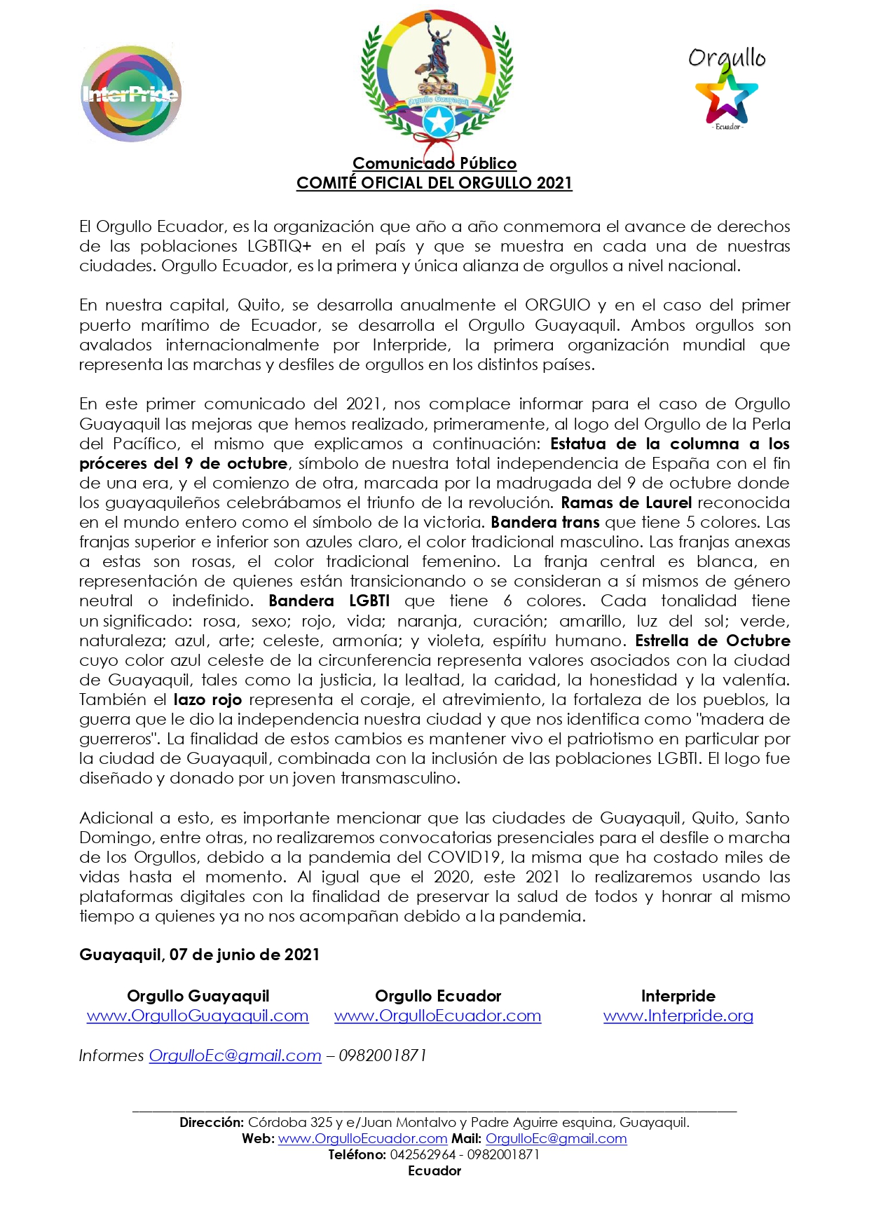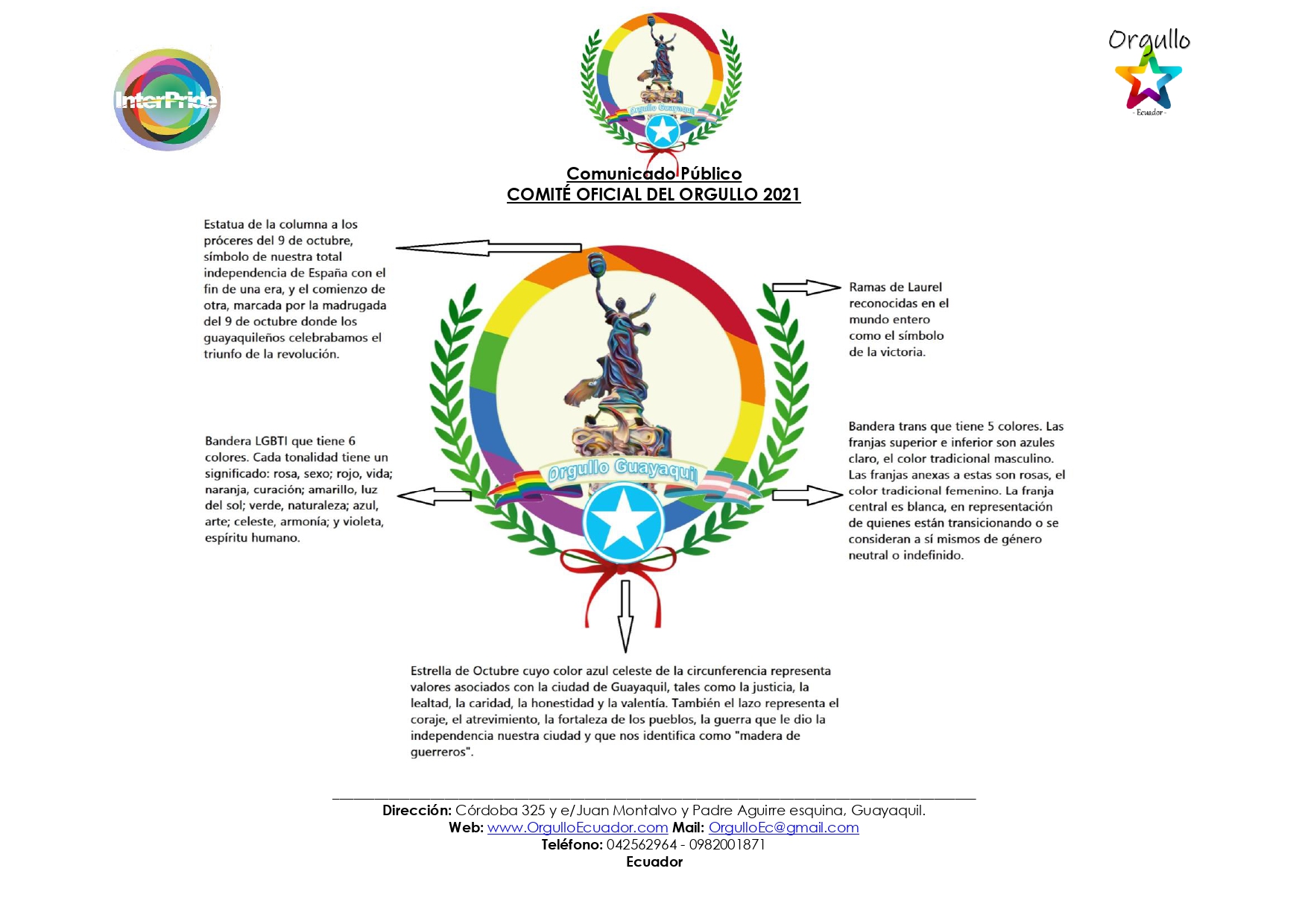 En este primer comunicado del 2021, nos complace informar para el caso de Orgullo Guayaquil las mejoras que hemos realizado, primeramente, al logo del Orgullo de la Perla del Pacífico, el mismo que explicamos a continuación: Estatua de la columna a los próceres del 9 de octubre, símbolo de nuestra total independencia de España con el fin de una era, y el comienzo de otra, marcada por la madrugada del 9 de octubre donde los guayaquileños celebrábamos el triunfo de la revolución. Ramas de Laurel reconocida en el mundo entero como el símbolo de la victoria. Bandera trans que tiene 5 colores. Las franjas superior e inferior son azules claro, el color tradicional masculino. Las franjas anexas a estas son rosas, el color tradicional femenino. La franja central es blanca, en representación de quienes están transicionando o se consideran a sí mismos de género neutral o indefinido. Bandera LGBTI que tiene 6 colores. Cada tonalidad tiene un significado: rosa, sexo; rojo, vida; naranja, curación; amarillo, luz del sol; verde, naturaleza; azul, arte; celeste, armonía; y violeta, espíritu humano. Estrella de Octubre cuyo color azul celeste de la circunferencia representa valores asociados con la ciudad de Guayaquil, tales como la justicia, la lealtad, la caridad, la honestidad y la valentía. También el lazo rojo representa el coraje, el atrevimiento, la fortaleza de los pueblos, la guerra que le dio la independencia nuestra ciudad y que nos identifica como «madera de guerreros». La finalidad de estos cambios es mantener vivo el patriotismo en particular por la ciudad de Guayaquil, combinada con la inclusión de las poblaciones LGBTI. El logo fue diseñado y donado por un joven transmasculino.