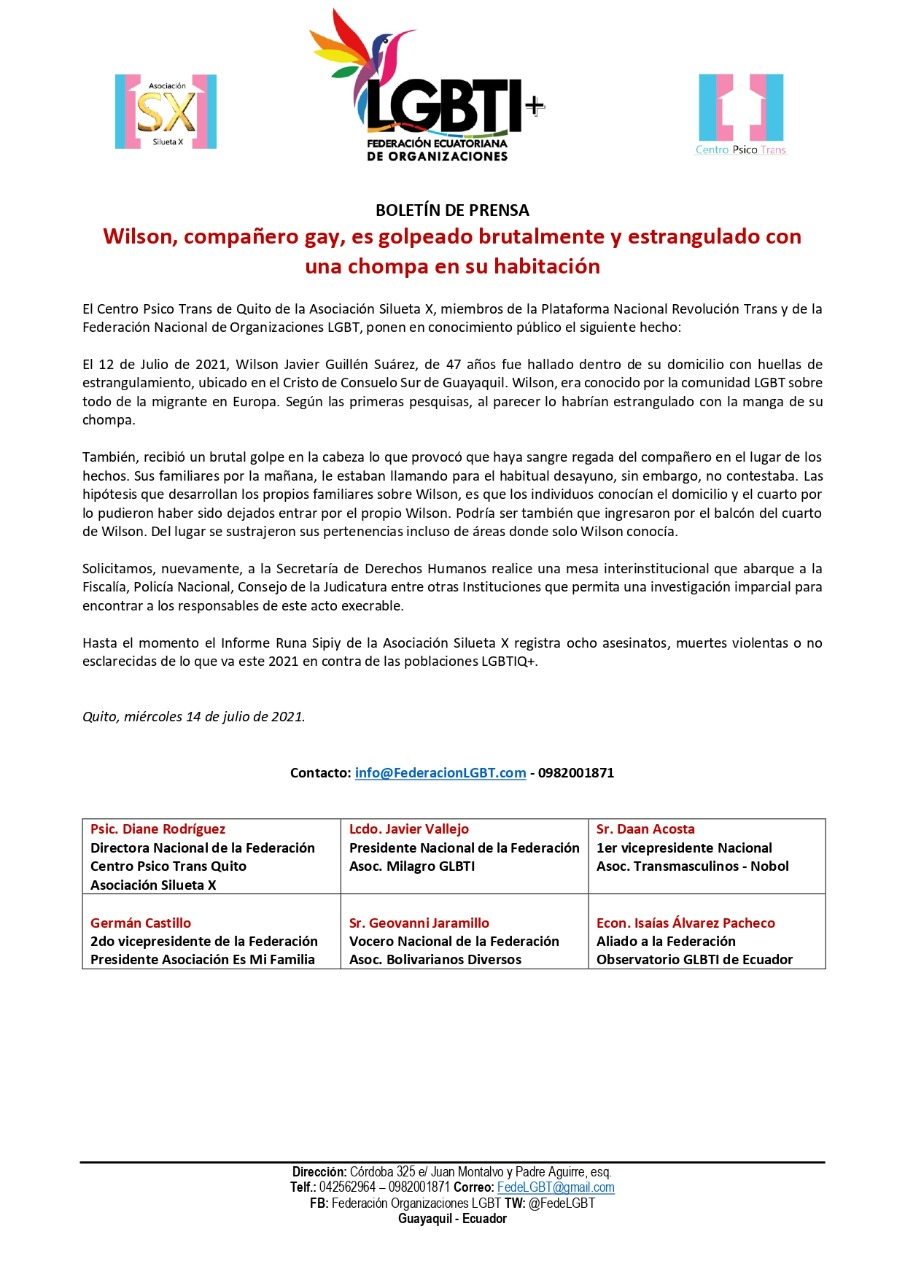 El Centro Psico Trans de Quito de la Asociación Silueta X, miembros de la Plataforma Nacional Revolución Trans y de la Federación Nacional de Organizaciones LGBT, ponen en conocimiento público el siguiente hecho: