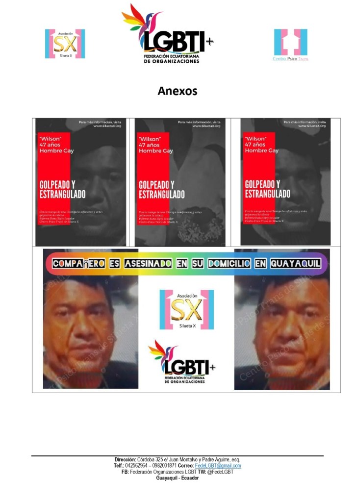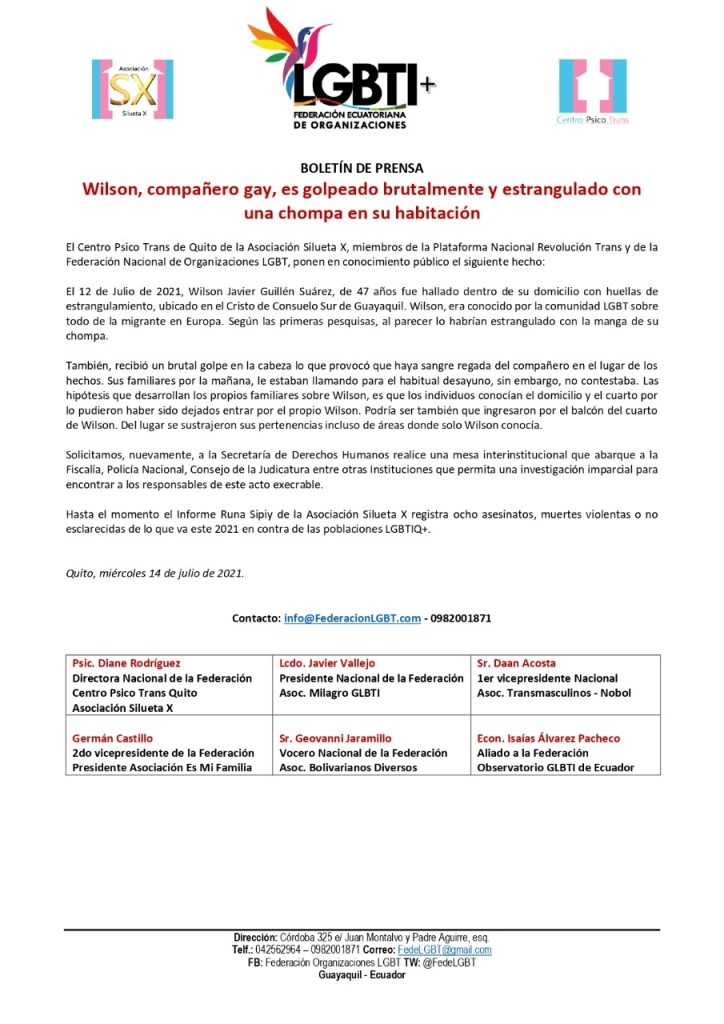 El 12 de Julio de 2021, Wilson Javier Guillén Suárez, de 47 años fue hallado dentro de su domicilio con huellas de estrangulamiento, ubicado en el Cristo de Consuelo Sur de Guayaquil. Wilson, era conocido por la comunidad LGBT sobre todo de la migrante en Europa. Según las primeras pesquisas, al parecer lo habrían estrangulado con la manga de su chompa.