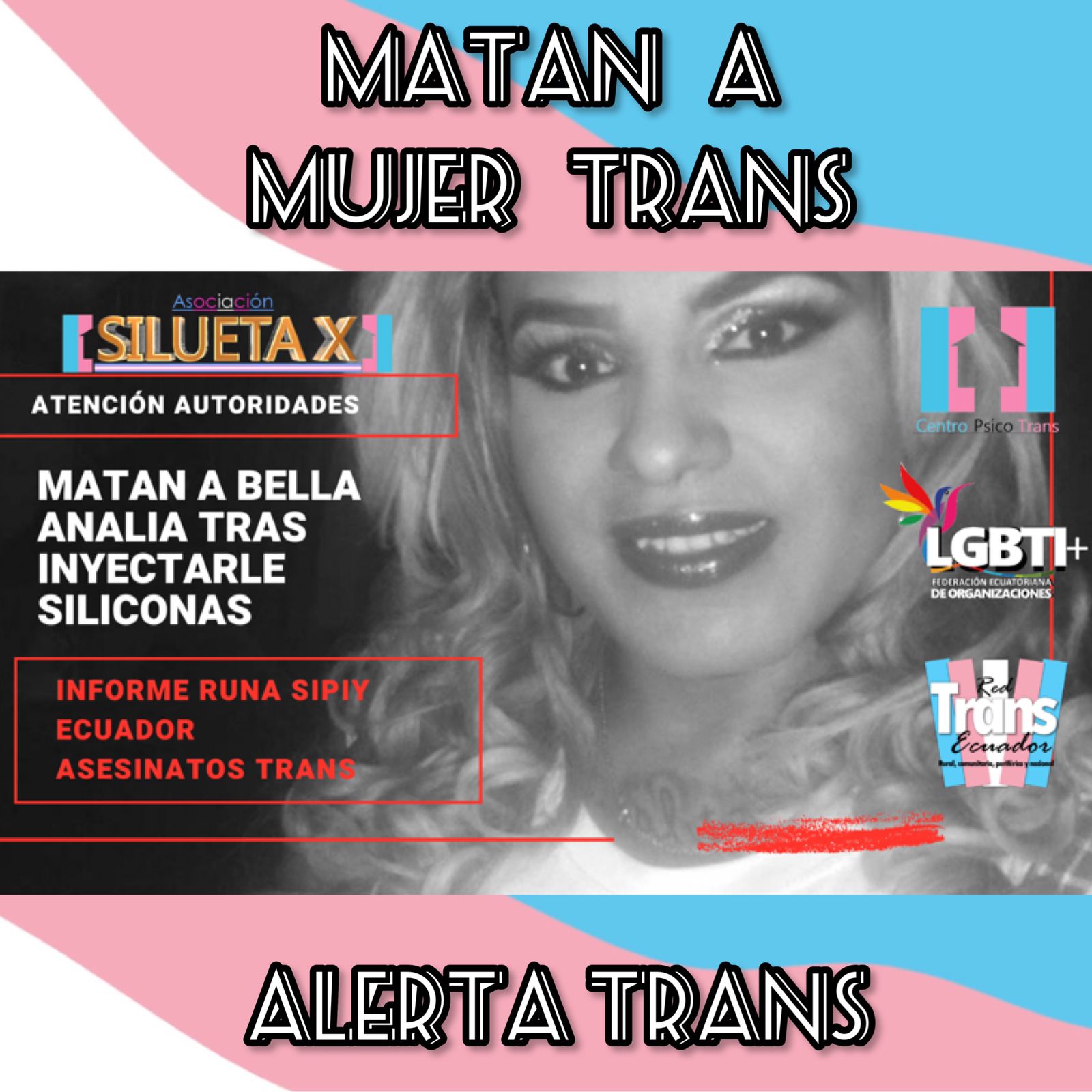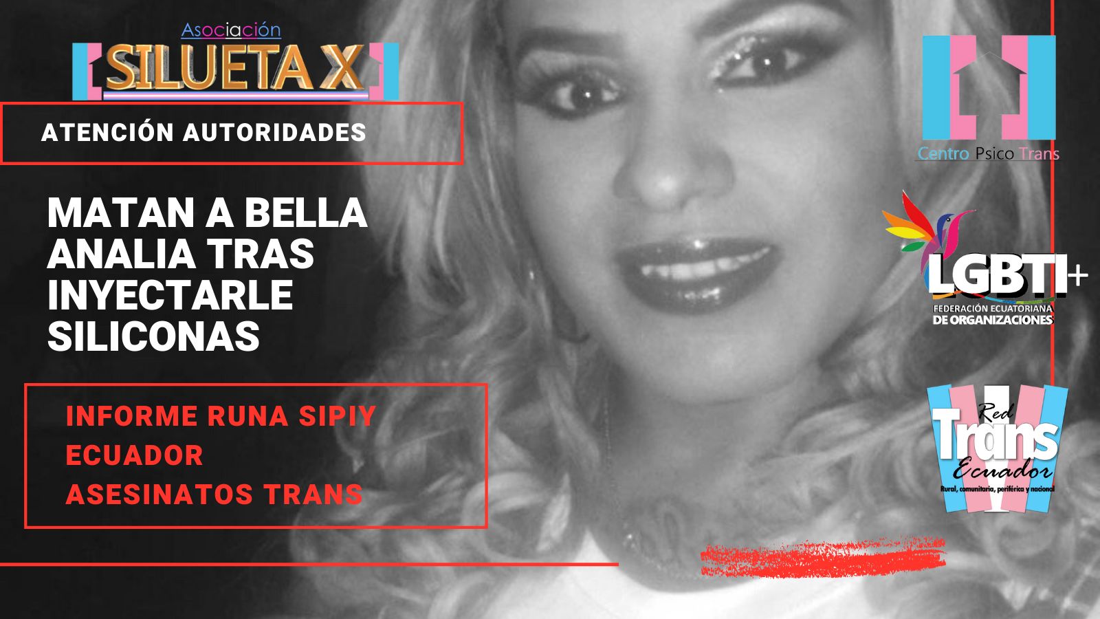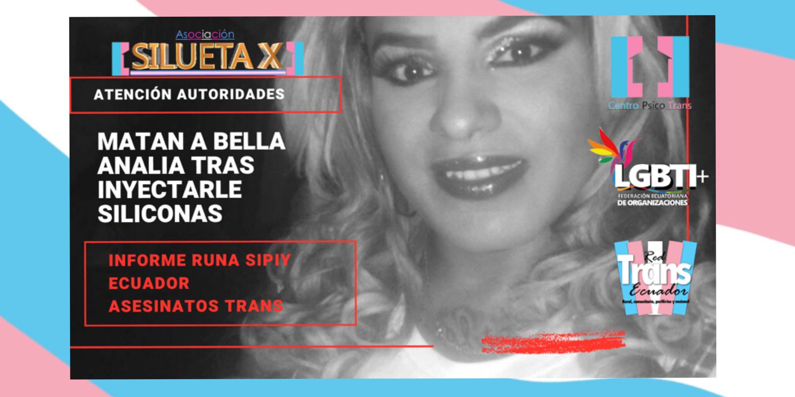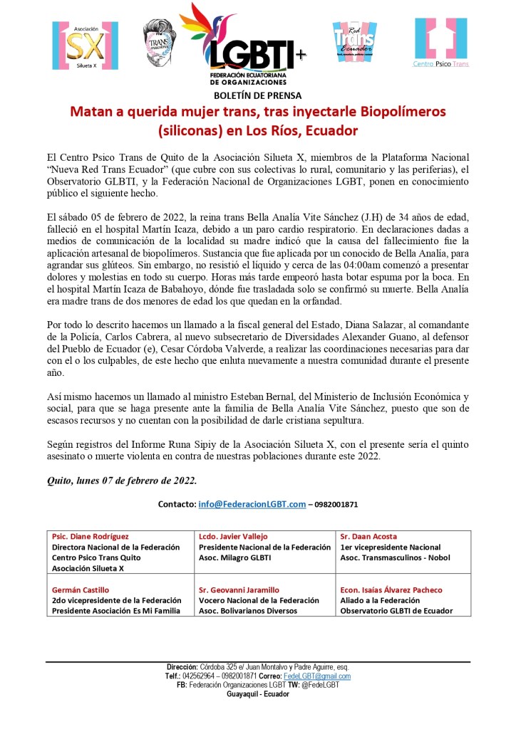 El Centro Psico Trans de Quito de la Asociación Silueta X, miembros de la Plataforma Nacional “Nueva Red Trans Ecuador” (que cubre con sus colectivas lo rural, comunitario y las periferias), el Observatorio GLBTI, y la Federación Nacional de O0072ganizaciones LGBT, ponen en conocimiento público el siguiente hecho.