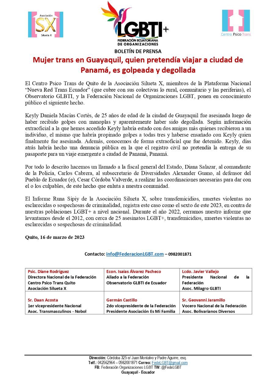 El Centro Psico Trans de Quito de la Asociación Silueta X, miembros de la Plataforma Nacional “Nueva Red Trans Ecuador” (que cubre con sus colectivas lo rural, comunitario y las periferias), el Observatorio GLBTI, y la Federación Nacional de Organizaciones LGBT, ponen en conocimiento público el siguiente hecho.
