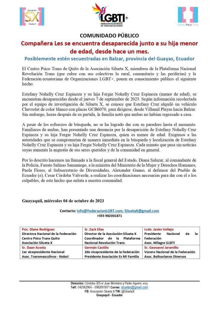 El Centro Psico Trans de Quito de la Asociación Silueta X, miembros de la Plataforma Nacional Revolución Trans (que cubre con sus colectivas lo rural, comunitario y las periferias) y la Federación ecuatoriana de Organizaciones LGBT+, ponen en conocimiento público el siguiente hecho.