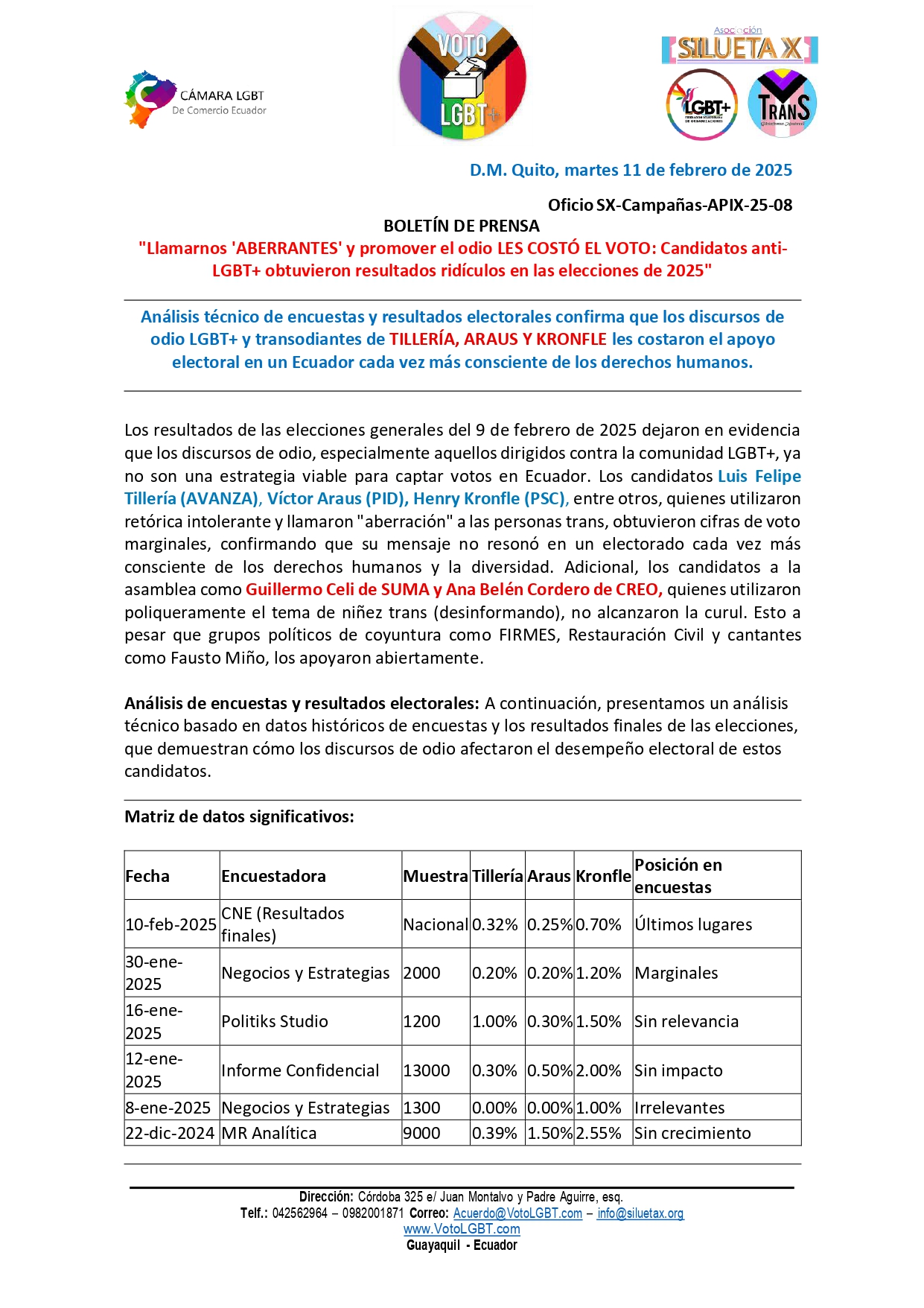 Análisis técnico de encuestas y resultados electorales confirma que los discursos de odio LGBT+ y transodiantes de TILLERÍA, ARAUS Y KRONFLE les costaron el apoyo electoral en un Ecuador cada vez más consciente de los derechos humanos.