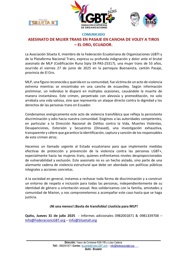 La Asociación Silueta X, miembro de la Federación Ecuatoriana de Organizaciones LGBTI y de la Plataforma Nacional Trans, expresa su profunda indignación y dolor ante el brutal asesinato de MLP (Codificación Runa Sipiy SX-PAS-25317), una mujer trans de 53 años, ocurrido el viernes 27 de junio de 2025 en la parroquia Buenavista, cantón Pasaje, provincia de El Oro.